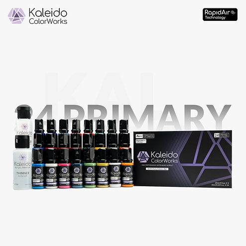 - Kaleido paints are pre-thinned water-based acrylics, ready for use straight from the bottle with 0.3–0.5mm airbrushes.