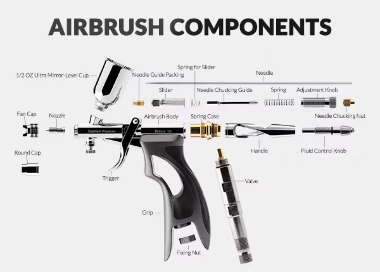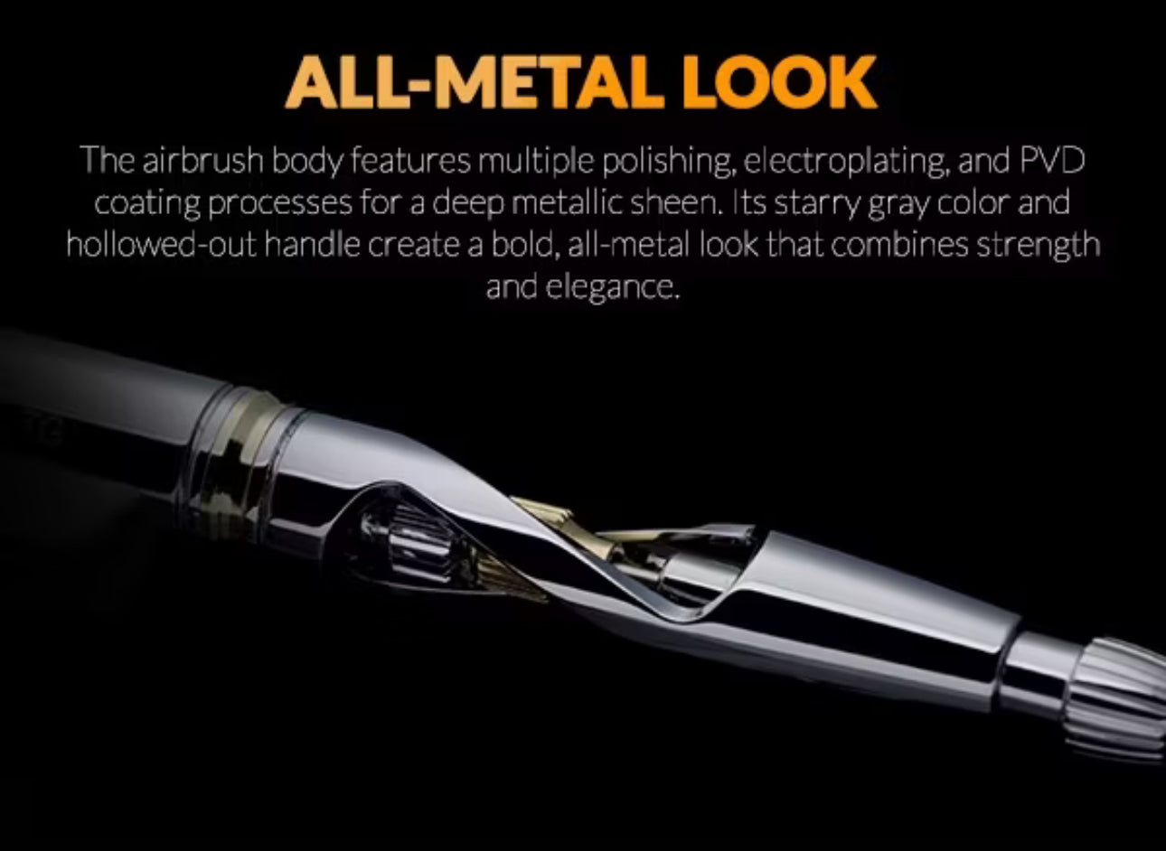 The airbrush body features multiple polishing, electroplating, and PVD coating processes for a deep metallic sheen. Its starry gray color and hollowed-out handle create a bold, all-metal look that combines strength and elegance.