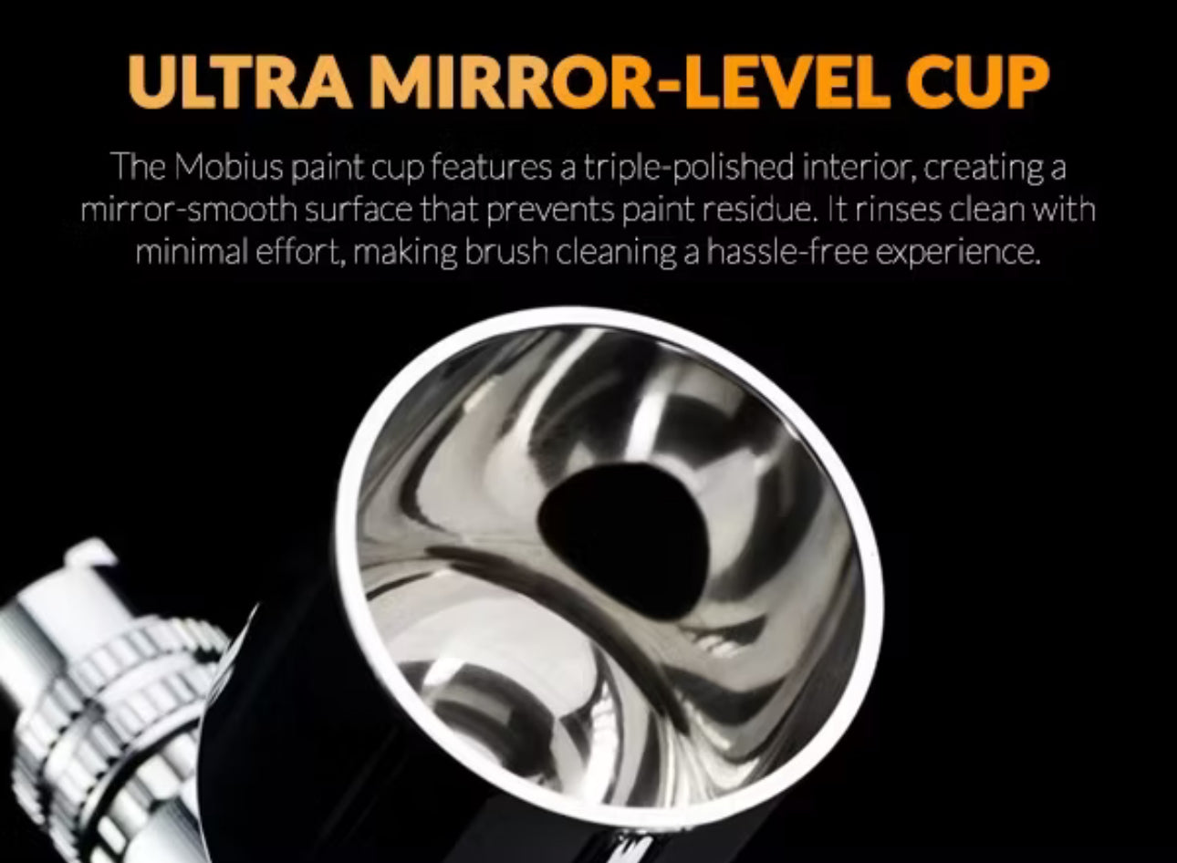 The Mobius paint cup features a triple-polished interior, creating a mirror-smooth surface that prevents paint residue. It rinses clean with minimal effort, making brush cleaning a hassle-free experience.